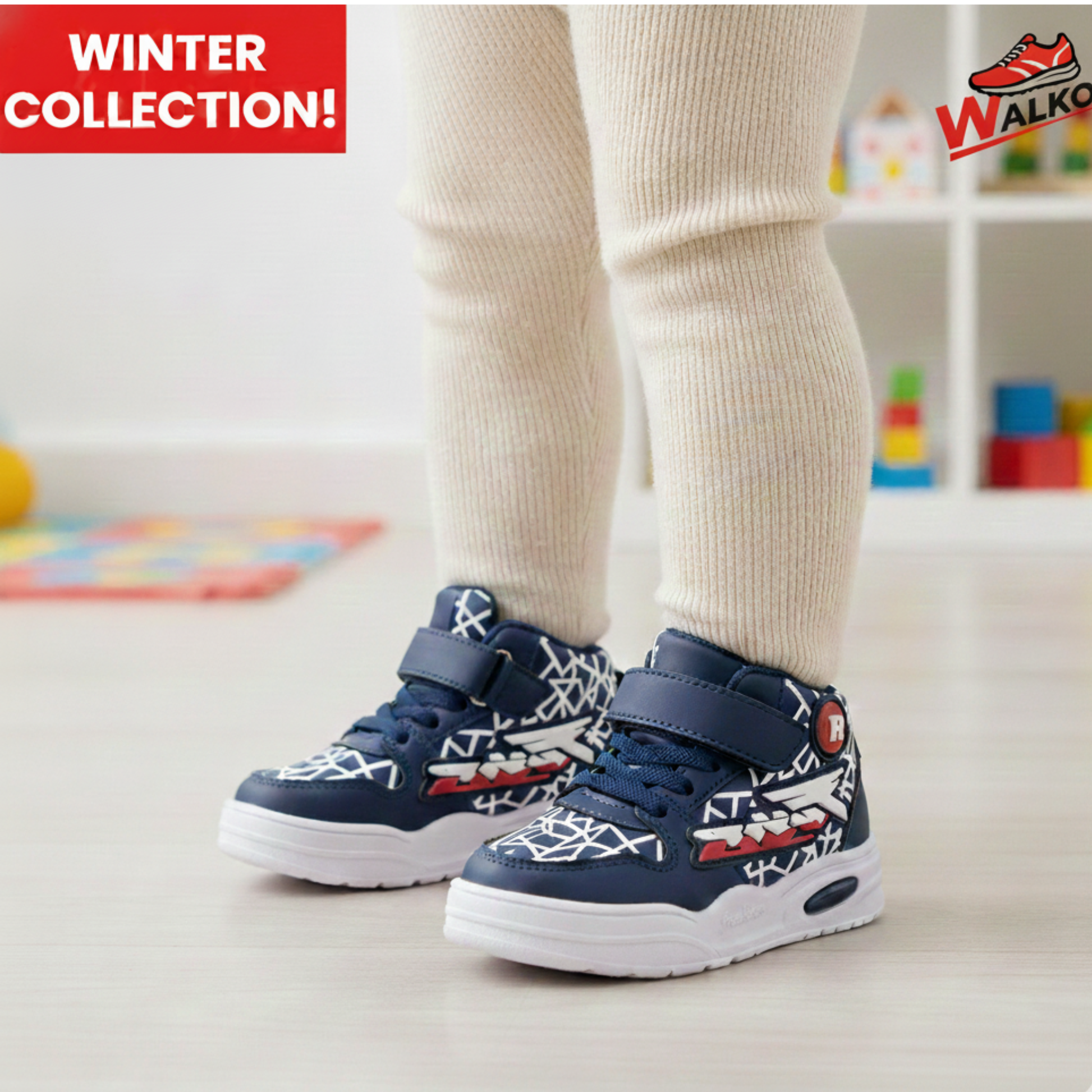 Give your little one the perfect mix of style, comfort, and support with these kids navy blue high-top sneakers. Designed for active boys, these shoes feature a secure Velcro strap with lace detail for easy wear and a snug fit. The sporty graphic design adds a cool look, while the lightweight cushioned sole ensures all-day comfort for school, playtime, and outings.