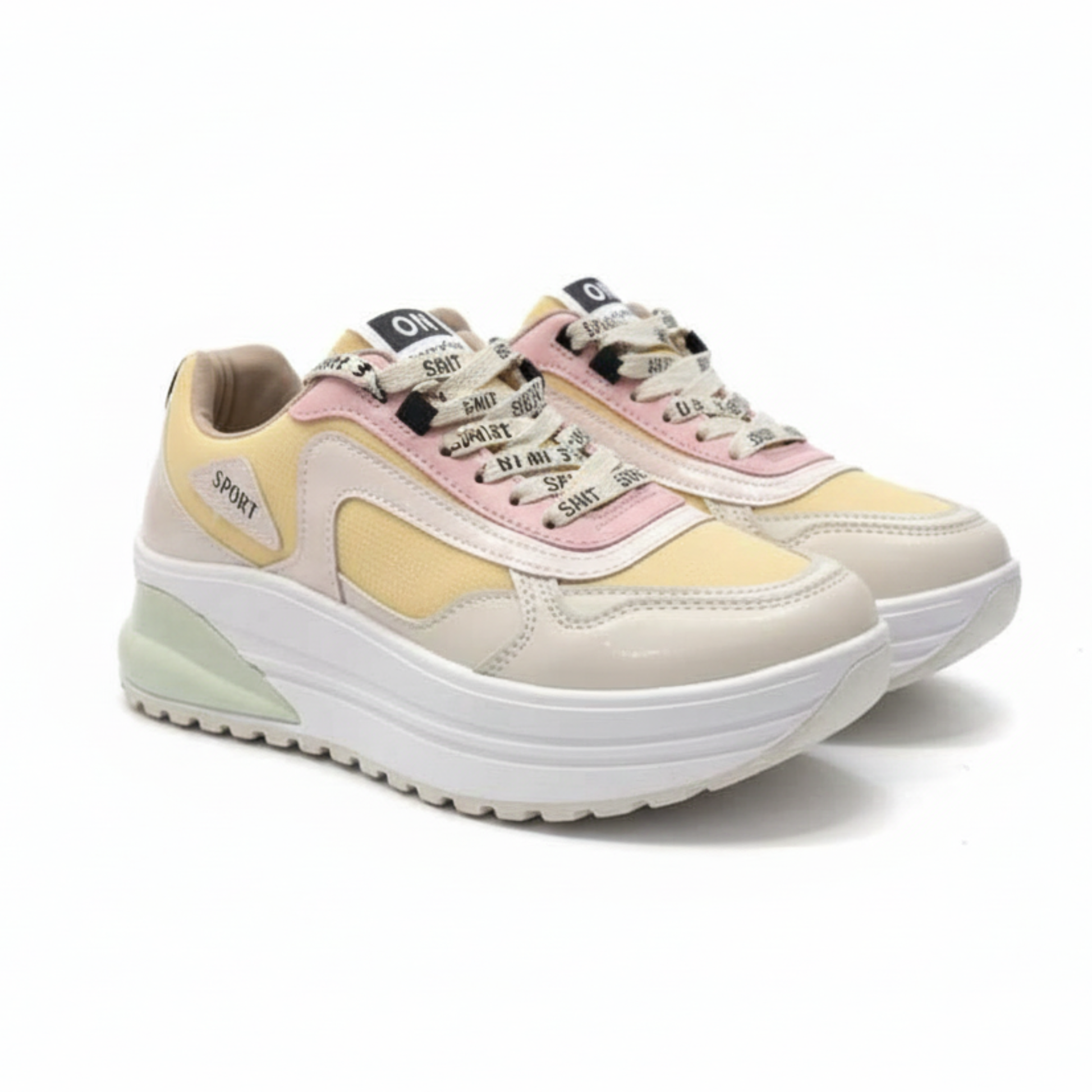 Designed with a soft blend of cream, yellow, pink, and mint tones for a modern, stylish vibe. Built with a lightweight platform sole and breathable upper, these sneakers provide long-lasting comfort for daily activities.